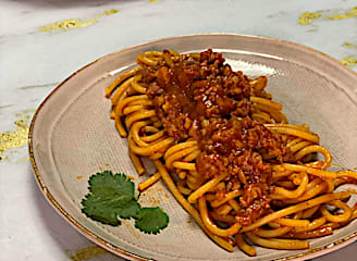 פסטה בולונז - פסטה, בשר טחון, רסק עגבניות, בצל, שום, מלח, פלפל, פפריקה, מרק עוף, עלי דפנה