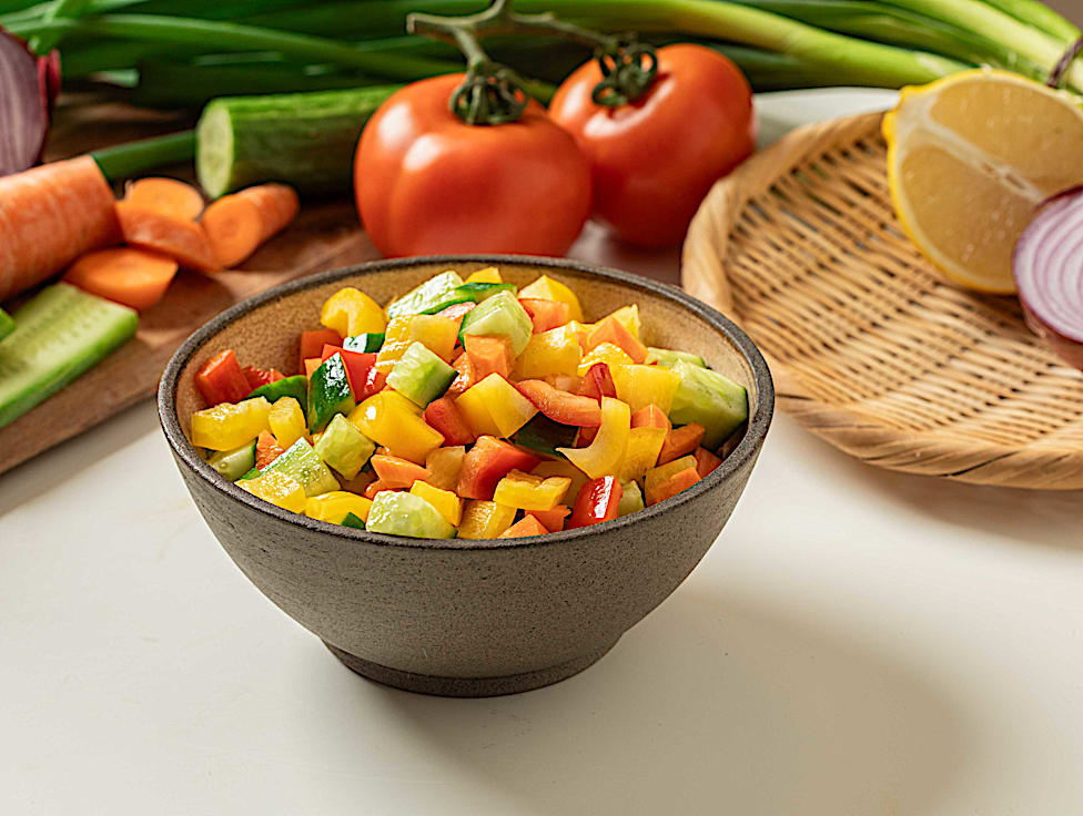 סלט ירקות של מלפפון, גזר, גמבה, פלפל צהוב.