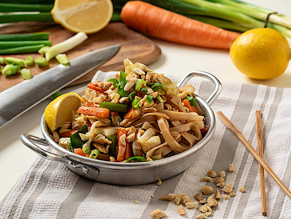 אטריות אורז, (טופו), בוטנים, גזר, כרוב, בצל ירוק, סויה, צ׳ילי מתוק, טריאקי, חומץ אורז, שמן שומשום.