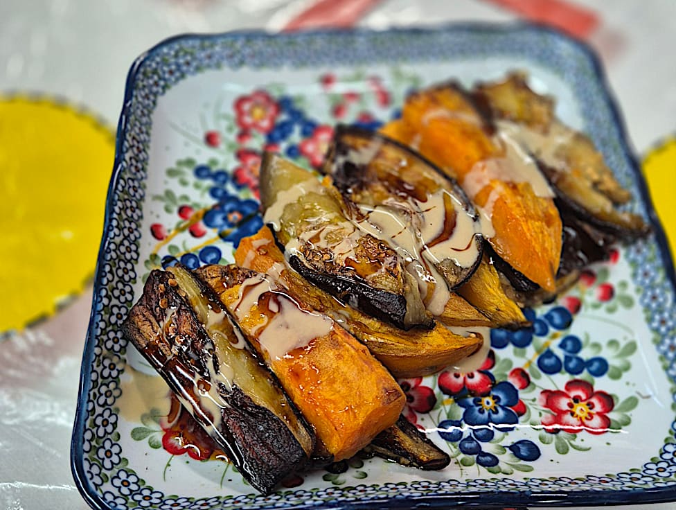 רצועות חציל ובטטה צלויות בתנור בזילוף של סילאן וטחינה גולמית.נחמד כמנה ראשונה או כתוספת לצד מנה עקרית במרכז שולחן** לא מכיל גלוטן עד רמת התבלינים, כלים נקיים ואריזה נפרדת (הסביבה אינה סטרילית מגלוטן)