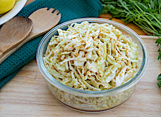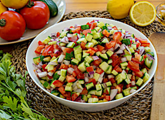 כרובית, בצל סגול, עגבניה, זיתים, עלי רוקט, פטרוזיליה, טחינה, שמן זית, מלח ולימון