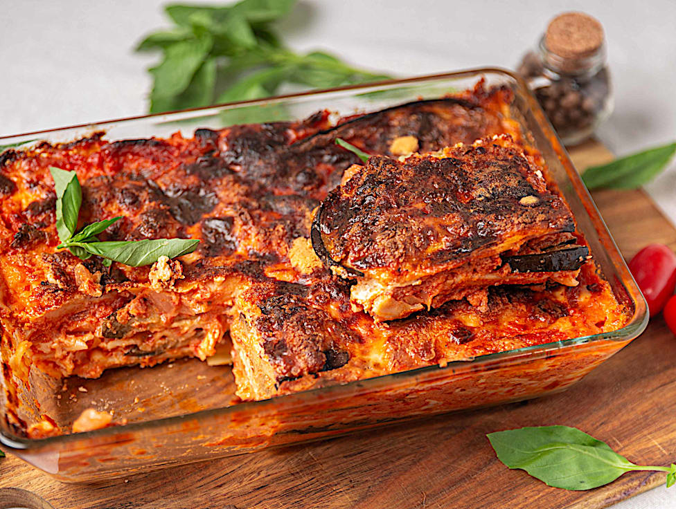 לזניה עשירה עם שכבות בשמל ,חציל ורוטב רוזה עם עגבניות בזיליקום ושמנת, פרמזן ומוצרלה.