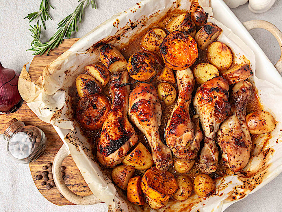 שוקי עוף עסיסיות, צלויות עם תפוחי אדמה ובטטה ברוטב מתקתק של סילאן וחרדל גרגירים, שמעניקים שילוב מושלם מנחם וטעים.