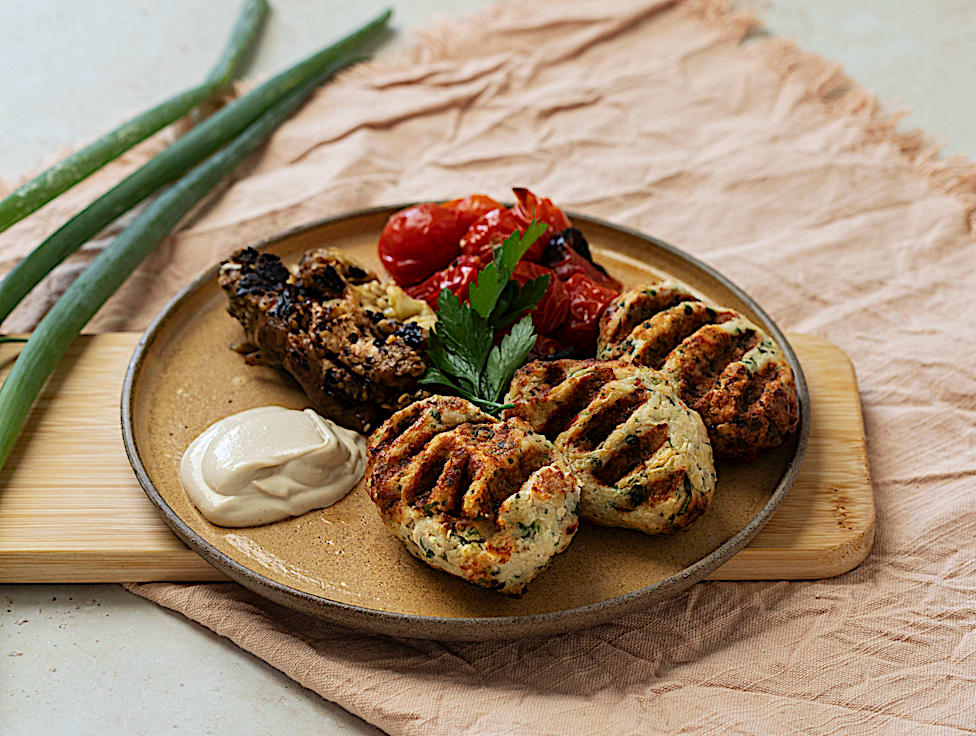 קבב דגים ים תיכוני עם ירקות צלויים ןטחינה לימונית - דג לבן (אמנון ולברק), ביצה, פטרוזיליה, נענע, פירורי לחם, שום, חציל, עגבניות שרי, טחינה גולמית, לימון, מלח, פלפל שחור