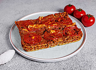 לזניה עם בשר טחון - בקר טחון, דפי לזניה, בצל, עגבניות מרוסקות, קישוא מגורד, רסק עגבניות, פרוסות עגבניה, תבלינים (מלח, פלפל שחור, פפריקה, שום גבישי, תערובת פטריות טחונה).