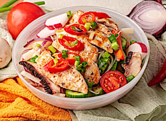 סלט ירקות חתוך גס עם פלפל צהוב, עגבניות שרי, מלפפון, קולורבי, בצל סגול, רצועות גזר ולימון, הרוטב מגיע בנפרד מהסלט.** לא מכיל גלוטן עד רמת התבלינים, כלים נקיים ואריזה נפרדת (הסביבה אינה סטרילית מגלוטן)