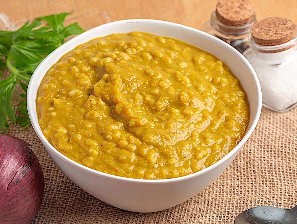 מרק אפונה טחון וחלק, מומלץ עם גריסי פנינה מבושלים שמוסיפים מרקם ושובע.