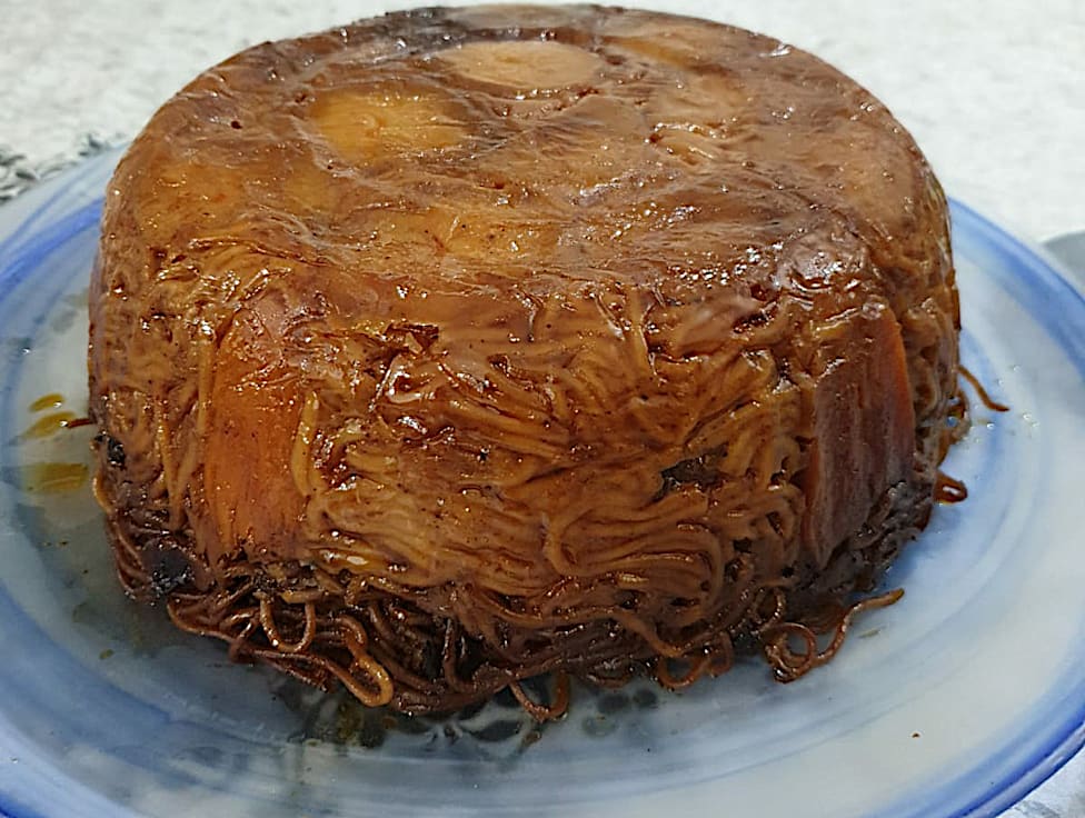 חמין ספגטי עם ירקות (בטטה, תפוח אדמה, גזר, קישוא, בצל ושום, ביצים) ושוקיים טריות