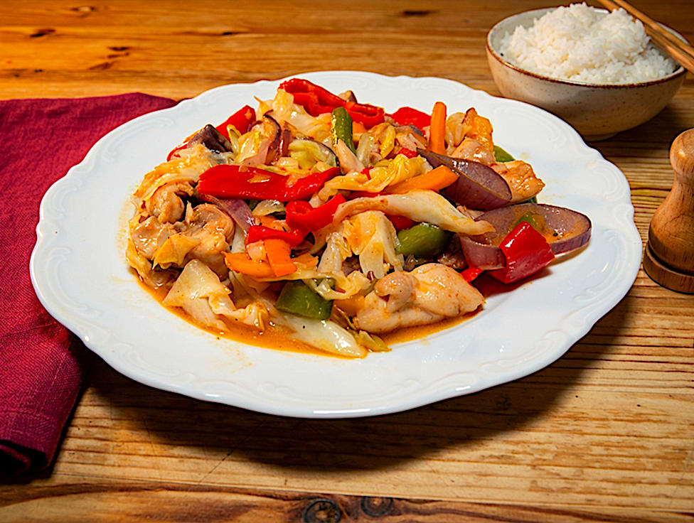 חזה עוף מוקפת עם ירקות צבעוניים ורוטב אסייתי עמוק שנעשה במקום. להשלמת החוויה מתווסף אורז לבן שסופג את כל הטעמים. מנה עשירה, צבעונית ומלאת חיים.