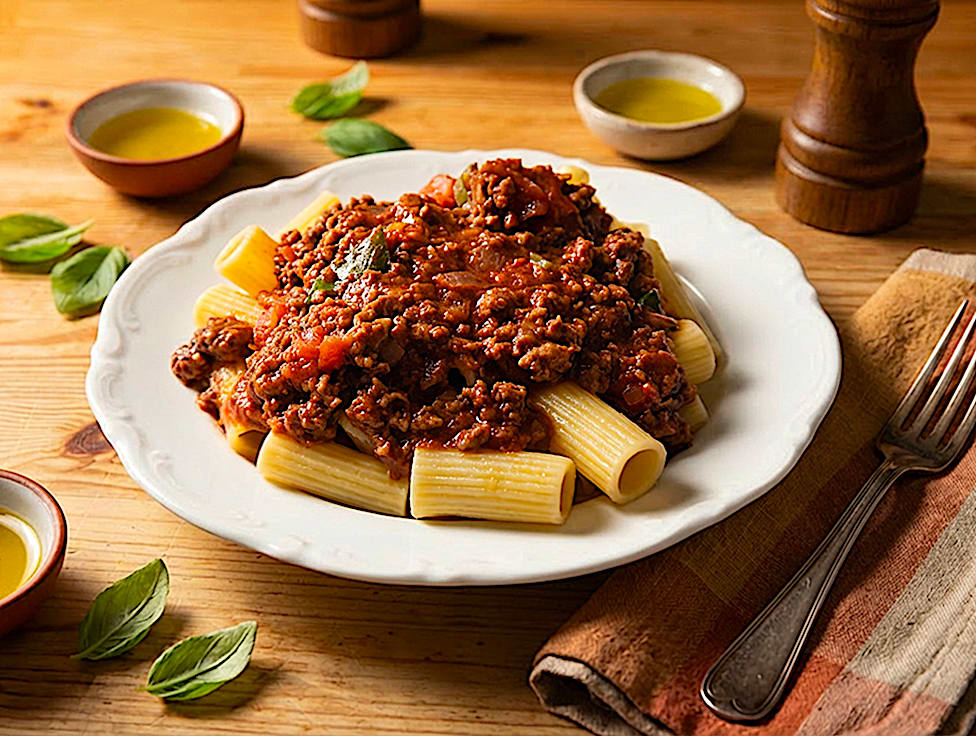 פסטה פנה, בשר טחון, בצל, שמן זית, שום, רסק עגבניות, עגבניה, מלח, פלפל, בהרט, בזילקום
