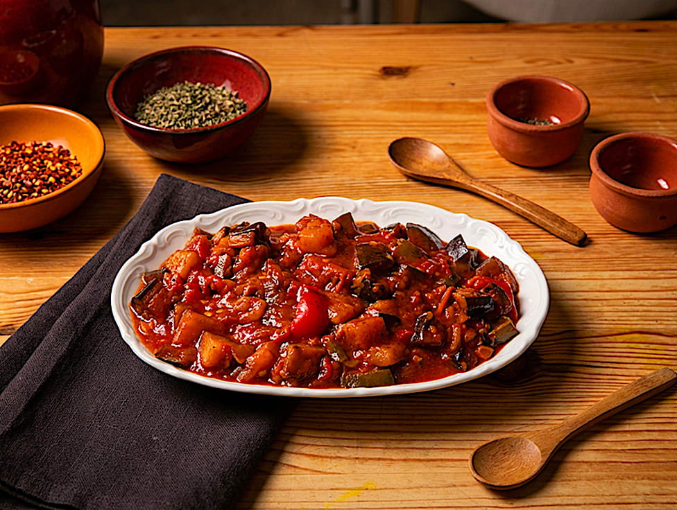 הסלט שהחלה של שבת מחכה לו. קוביות חציל קטנות שנצלו ובושלו לאט ברוטב סמיך של עגבניות קלופות, שום טרי ופלפלים. סלט עשיר, ריבתי ופיקנטי בדיוק במידה הנכונה.