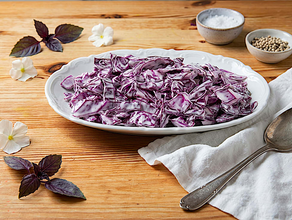 הסלט שמוסיף צבע וטעם לכל ארוחה. כרוב סגול טרי ופריך, חתוך דק-דק ועטוף ברוטב מיונז עשיר וקטיפתי. השילוב בין הפריכות של הכרוב לרוטב המאוזן יוצר תוספת מרעננת, צבעונית ונוסטלגית שפשוט אי אפשר להפסיק לאכול.