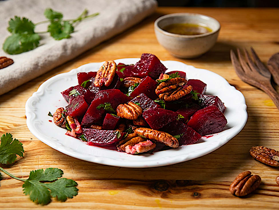 סלקים טריים שבושלו עד לריכוך, חתוכים לקוביות קטנות ומתובלים ברוטב ביתי קלאסי. הפטרוזיליה ואגוזי הפקאן מוסיפים טעמים ומרקמים מושלמים. מנה טעימה, בריאה ומלאה בברזל.