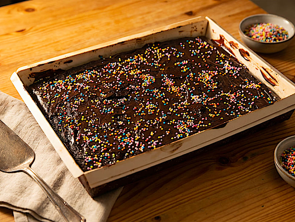עוגת שוקולד רכה וטעימה בתבנית מרובעת עם ציפוי שוקולד וסוכריות צבעוניות