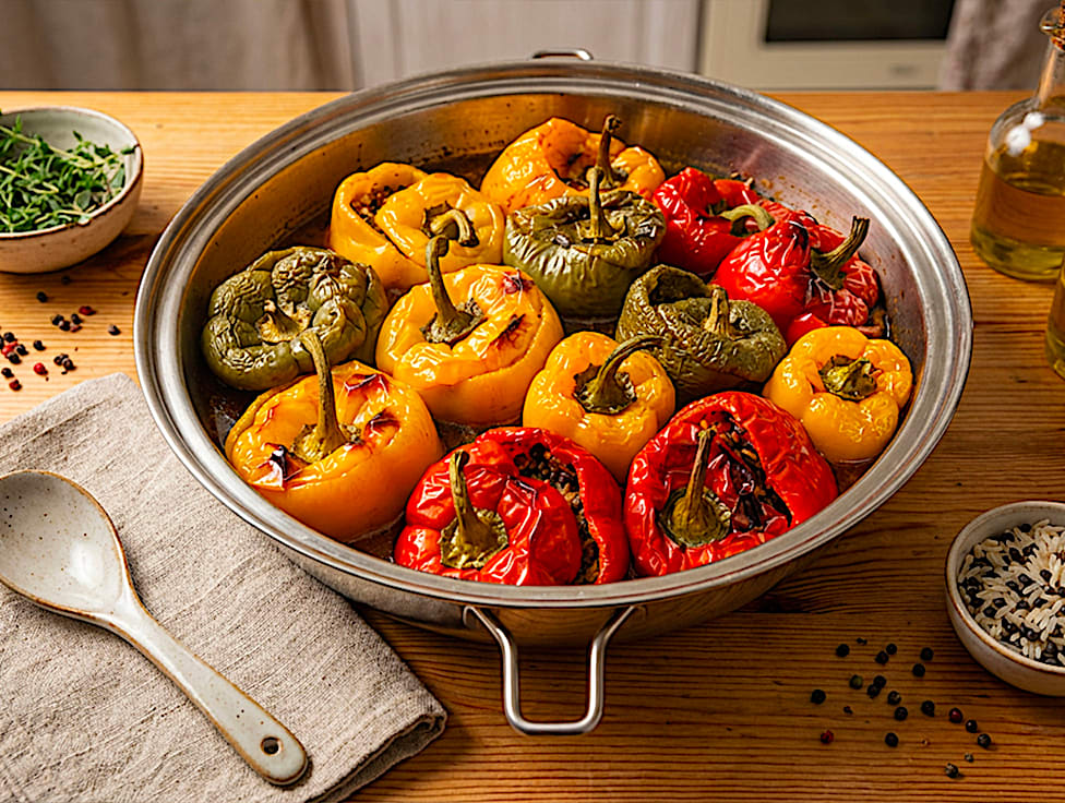 פלפלים בצבעים ממולאים באורז, ירקות (בצל, קישוא, גזר)וגם פטרוזיליה ועדשים שחורות. הפלפלים נימוחים וטעימים אחרי שהם מקבלים גם "מכת חום" בתנור (אחרי הבישול), מנה טבעונית משביעה, בריאה ומושלמת. .
