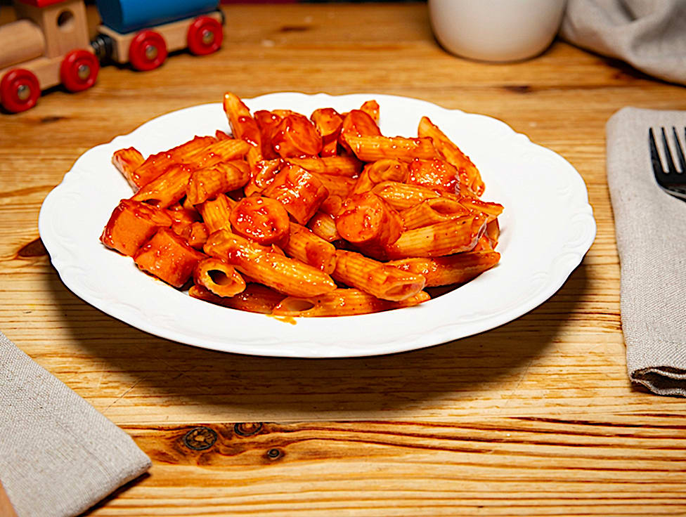 ארוחת צהריים מושלמת ופשוטה שילדים פשוט טורפים. פסטה ברוטב אדום קלאסי ועשיר המבוסס על רסק עגבניות, וכמובן אם רוצים אז יש כזו עם המון עיגולי נקניקיות בפנים. מנה נקייה מ"הפתעות" (בלי חתיכות בצל או ירק שהילדים לפעמים מוציאים), רק טעם ביתי וטוב של פעם.