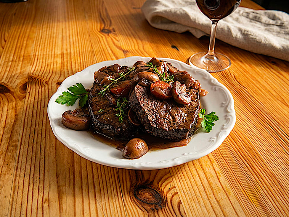 בקר כתף 5, פטריות שמפניון, יין קברנה סובניון, בצל, דבש, סוכר חום כהה, מקל קינמון, גזר, שום, פלפל שחור, מלח