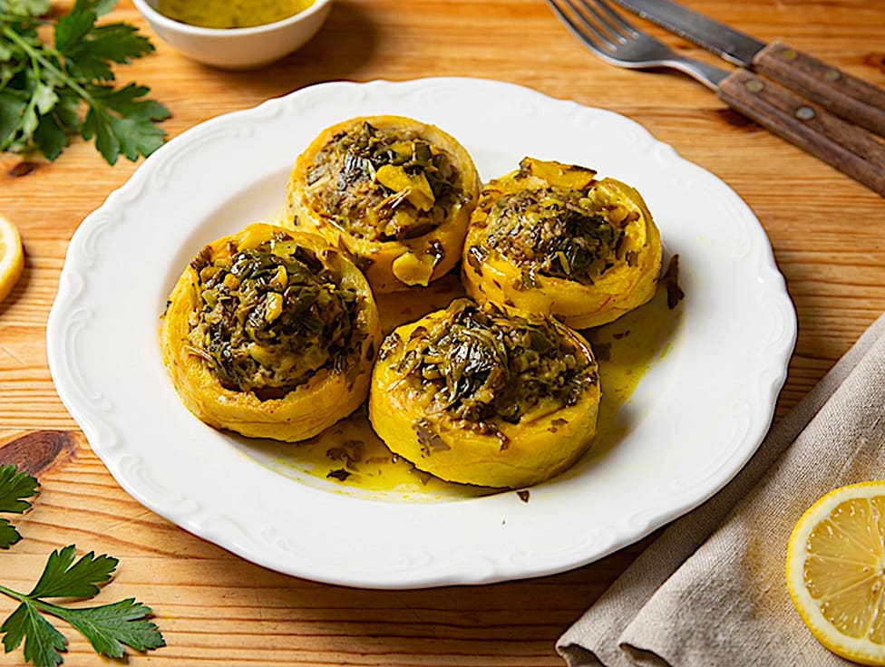 תחתיות ארטישוק בשרניות הממולאות בתערובת של בקר משובח (שפונדרה וצוואר), צנוברים קלויים ותיבול עדין של בהרט וכוסברה. הממולאים מתבשלים לאט ברוטב "זהוב" עשיר של לימון טרי, גרידת לימון וכורכום, שמעניקים למנה טעם לימוני עמוק ומרענן.