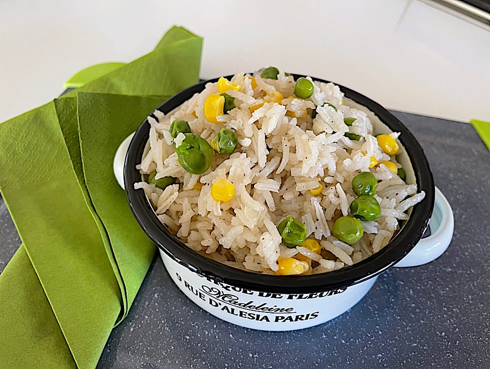 תוספת נחמדה של אורז בסמטי עם אפונה ותירס שגם הילדים יאהבו.
