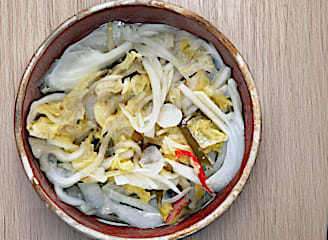 קימצ'י הוא מאכל קוריאני מסורתי, הכולל ירקות מותססים (בדרך כלל כרוב נאפה ודייקון) בתיבול עשיר של תבלינים.