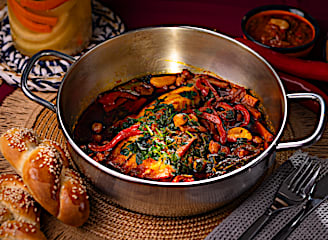 תבשיל בשר רך בישול איטי ברוטב עשיר, יחד עם גרגירי חומוס או תפוחי אדמה להעשרת הטעמים.