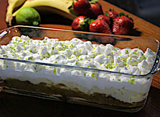 פודינג ברזילאי מחלב מרוכז וקוקוס עם סירופ שזיפים מיובשים מלמעלה.