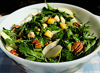 חסה, עלי בייבי, בצל סגול, תערובת אגוזים ביתית, שמן קנולה, חומץ בלסמי, סוכר דמררה, גרגירי חרדל ושומשום.