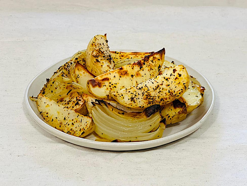 רבעי תפוחי אדמה ובצל צלויים בתנור** לא מכיל גלוטן עד רמת התבלינים, כלים נקיים ואריזה נפרדת (הסביבה אינה סטרילית מגלוטן)