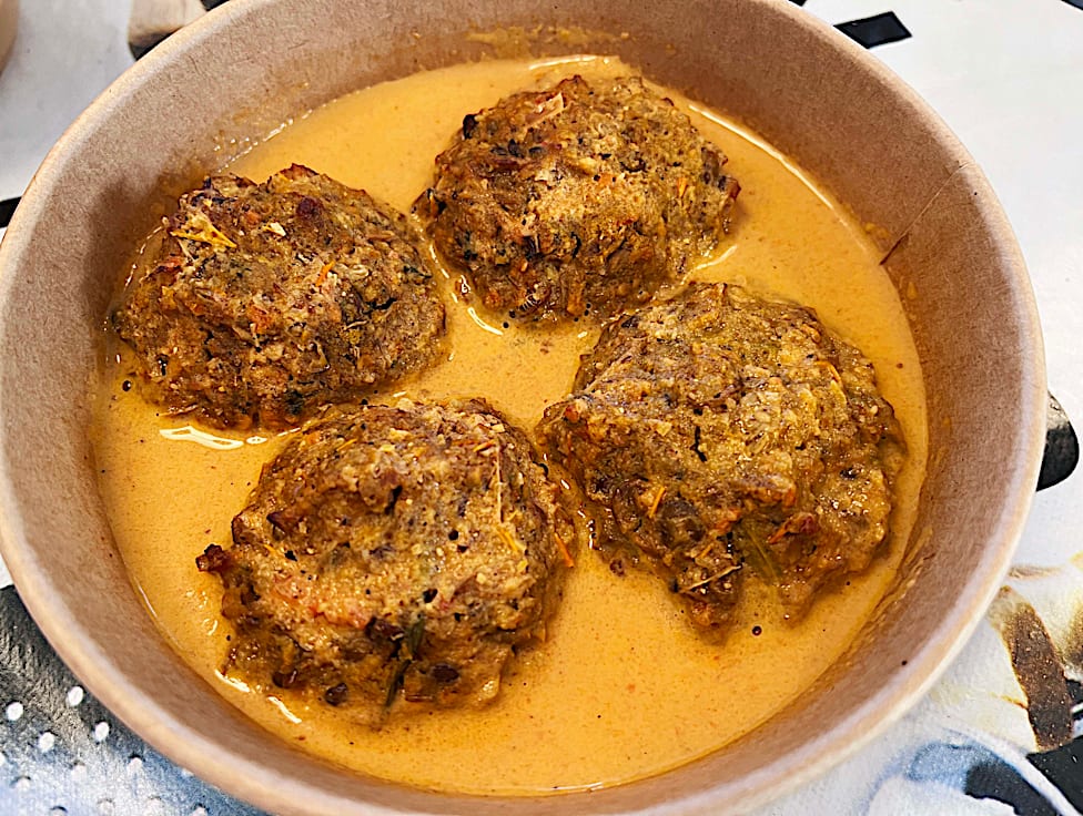 קציצות אפויות על בסיס עדשים וירקות מוגשות עם רוטב קארי אדום בטעם עדין משגע.