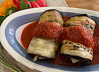 גלילות חצילים עם טופו ופטריות ברוטב עגבניות - חצילים, טופו, פטריות, בצל, שום, עשבי תיבול, רוטב עגבניות