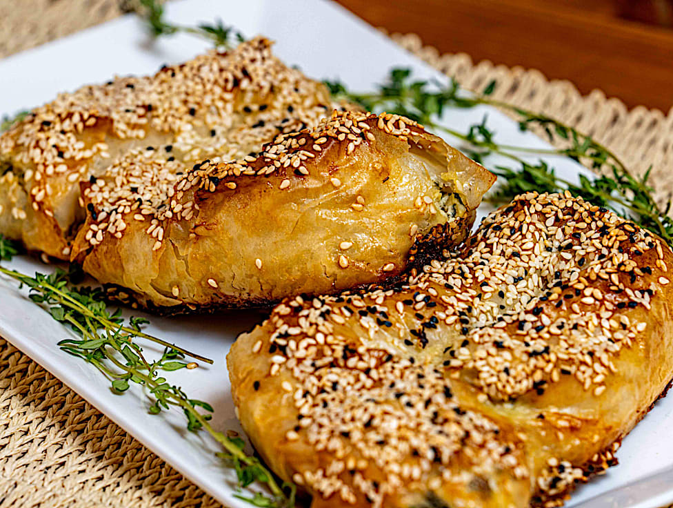 שבלולי פילו פריכים ממולאים בתערובת מנגולד טרי וגבינת כנען בציפוי שומשום