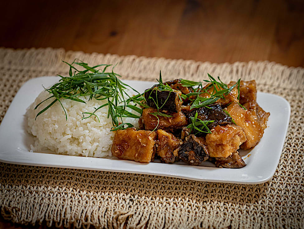 צ'זה טופו וחצילים+ אורז לבן טבעוני - חציל,טופו,בצל ירוק,קורנפלור,שומשום,סוכר חום,חומץ תפוחים/בן יין,רוטב סויה