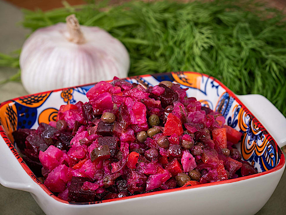 סלט סלק רוסי קלאסי- סלק מבושל ומתוק, קוביות תפוחי אדמה מבושלים, גזר ואפונה עם בצל סגול ומלפפונים חמוצים.