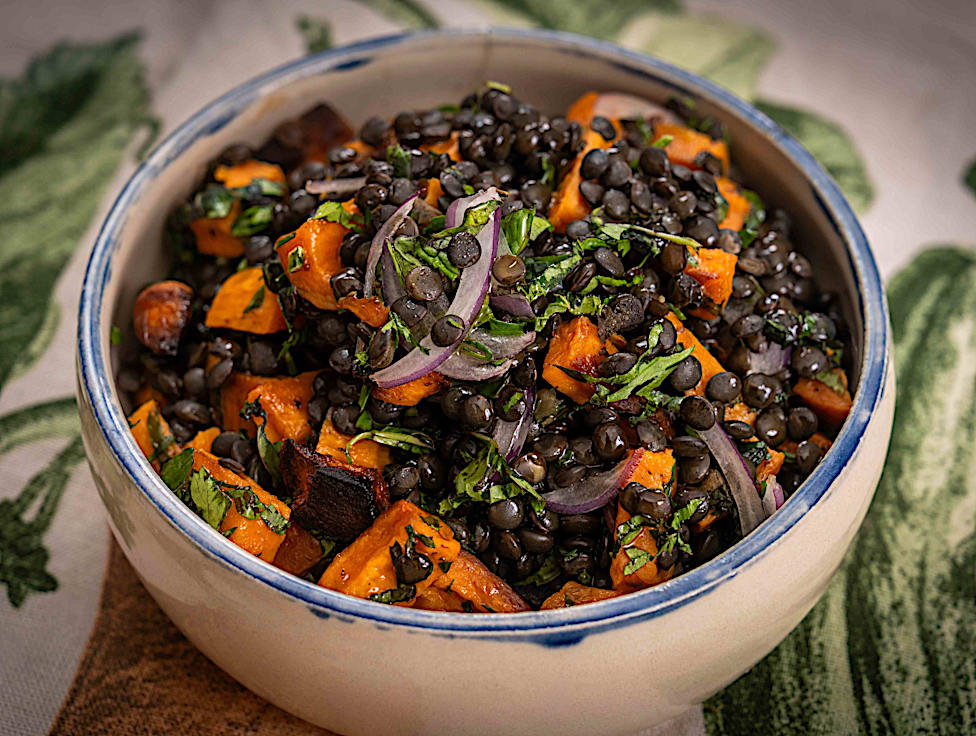 סלט מזין וצבעוני,עם עדשים שחורות עשירות בחלבון ובטטה מתוקה ורכה, בצל סגול ועשבי תיבול.