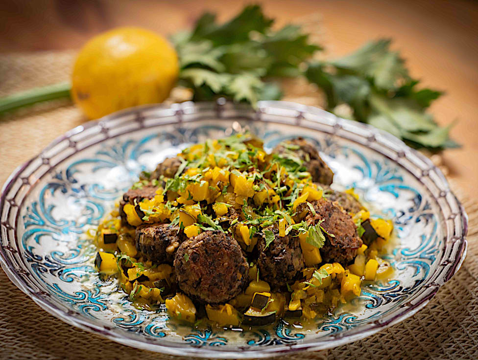 קציצות עדשים שחורות וירוקים ברוטב חמוסטה חמצמץ.