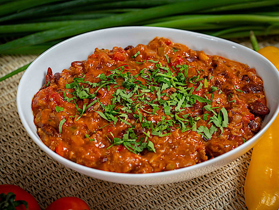 צ'ילי קון קרנה טבעוני עם ביונד מיט, מבושל לאט עם שעועית, ירקות ותיבול עדין. תבשיל מנחם שמתאים גם לילדים.