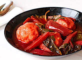 דג אמנון ברוטב אדום פיקנטי עם ירקות וגרגירי חומוס