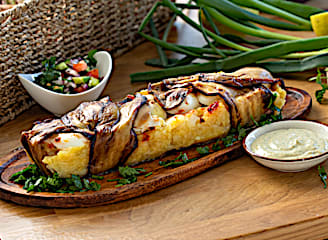 חציל, שמן זית, בשר טחון צמחי, בצל, פטריות, עגבניות, כמון, פפריקה, שום, מלח, פלפל שחור